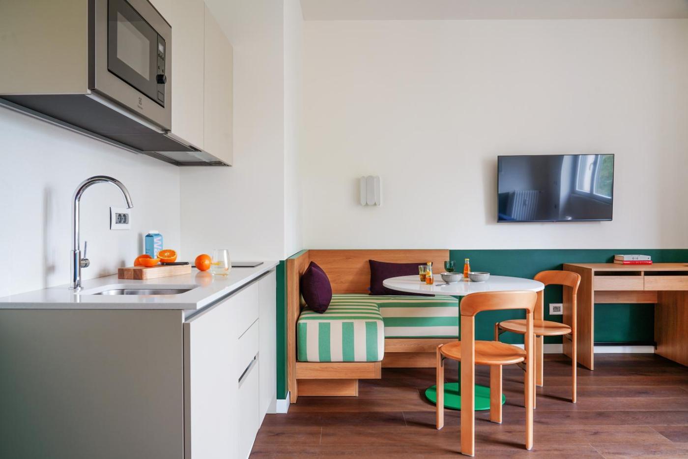 Monolocale Medium con Angolo Cottura. L’angolo cottura ben attrezzato è provvisto di fornelli, frigorifero, forno a microonde e utensili da cucina. Questo monolocale dispone di aria condizionata, bagno privato e TV a schermo piatto con servizio di streaming. L’alloggio offre 1 letto. ;