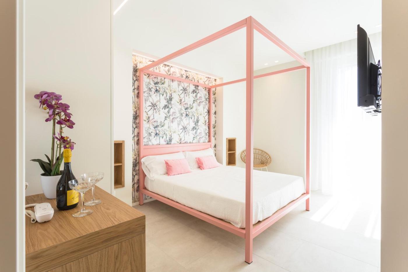 Camera Matrimoniale Superior con Vista Mare. Nuovissima camera completamente rinnovata al 4° o 5° piano dal design esclusivo, dotata di ampia doccia, balcone fronte mare, insonorizzazione e letti e materassi Dorelan. ;