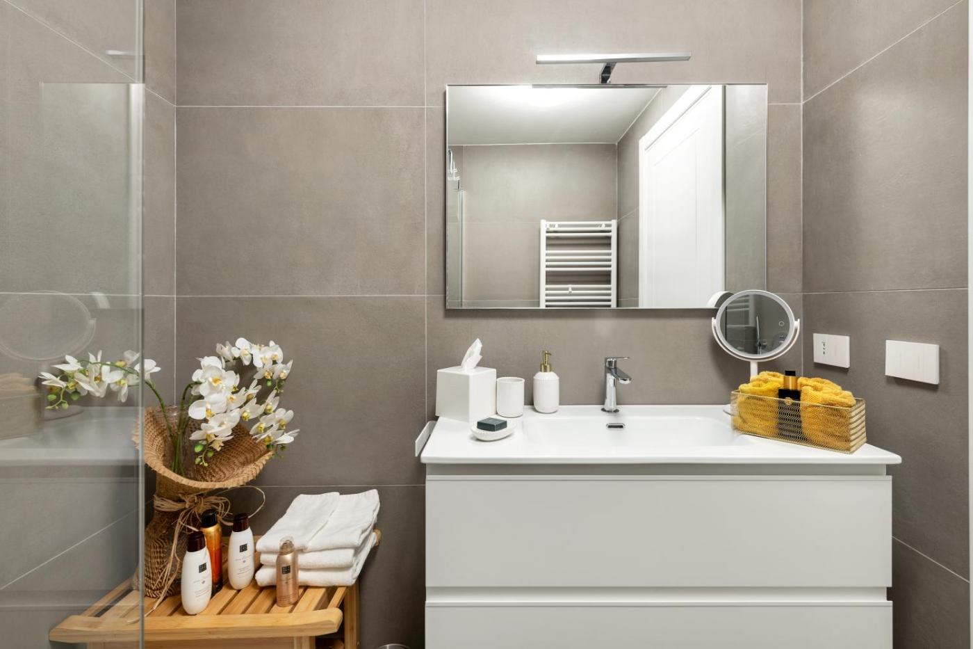 Appartamento con 1 Camera da Letto. The air-conditioned apartment features 1 bedroom and 1 bathroom with a shower and a bidet. Guests can make meals in the kitchenette that is fitted with a stovetop, a refrigerator, a dishwasher and kitchenware. This apartment has a washing machine, flat-screen TV, garden views, as well as winechampagne for guests. The unit offers 1 bed.