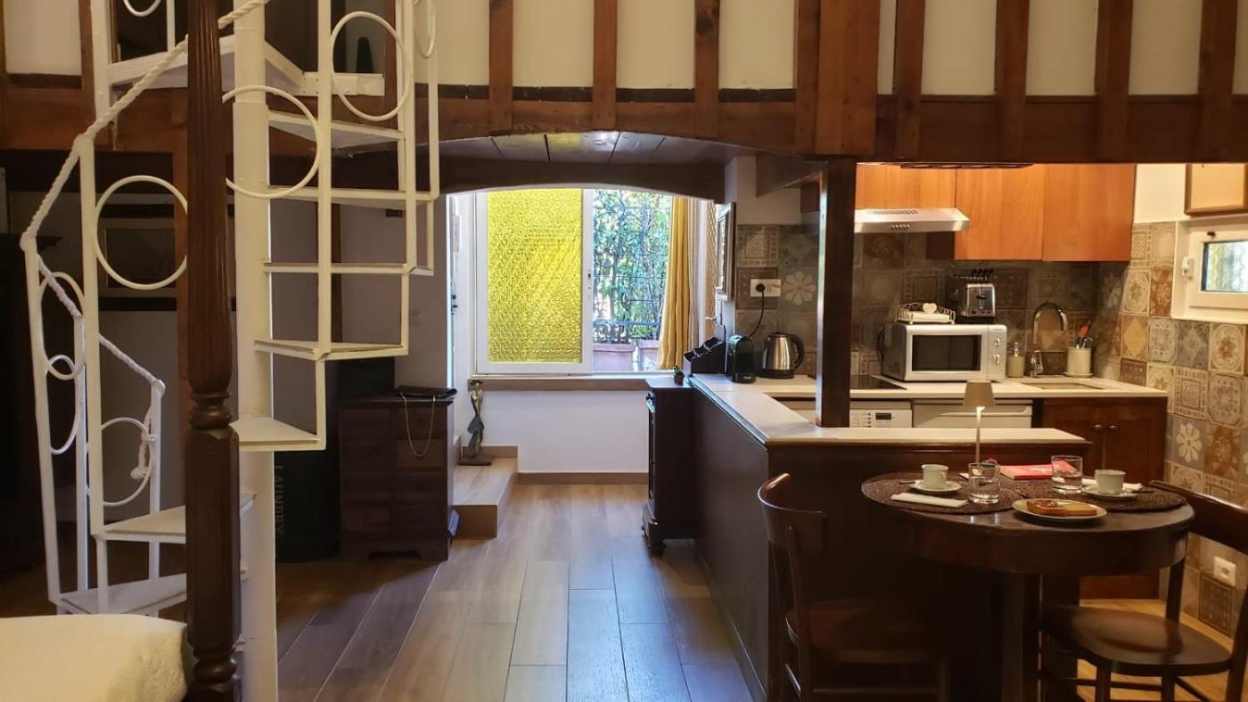 Questo appartamento con aria condizionata comprende 1 camera da letto e 1 bagno con bidet, doccia edi cortesia. Langolo cottura ha frigorifero, microonde e piano cottura, più macchina da caffè e bollitore elettrico.